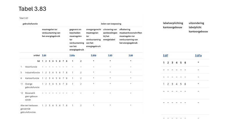 - 2 Als voor een gebruiksfunctie in tabel 3.83 regels zijn aangewezen, wordt voor die gebruiksfunctie aan het eerste lid voldaan door naleving van die regels.