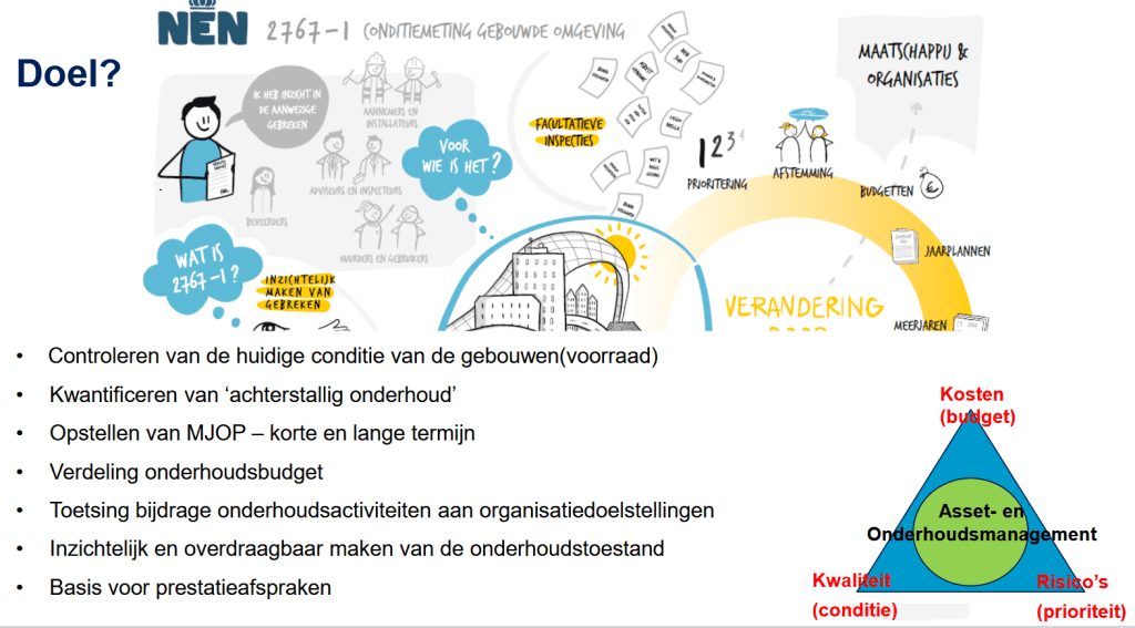 - om te controleren of het gebouw en installaties voldoen aan wet- en regelgeving.